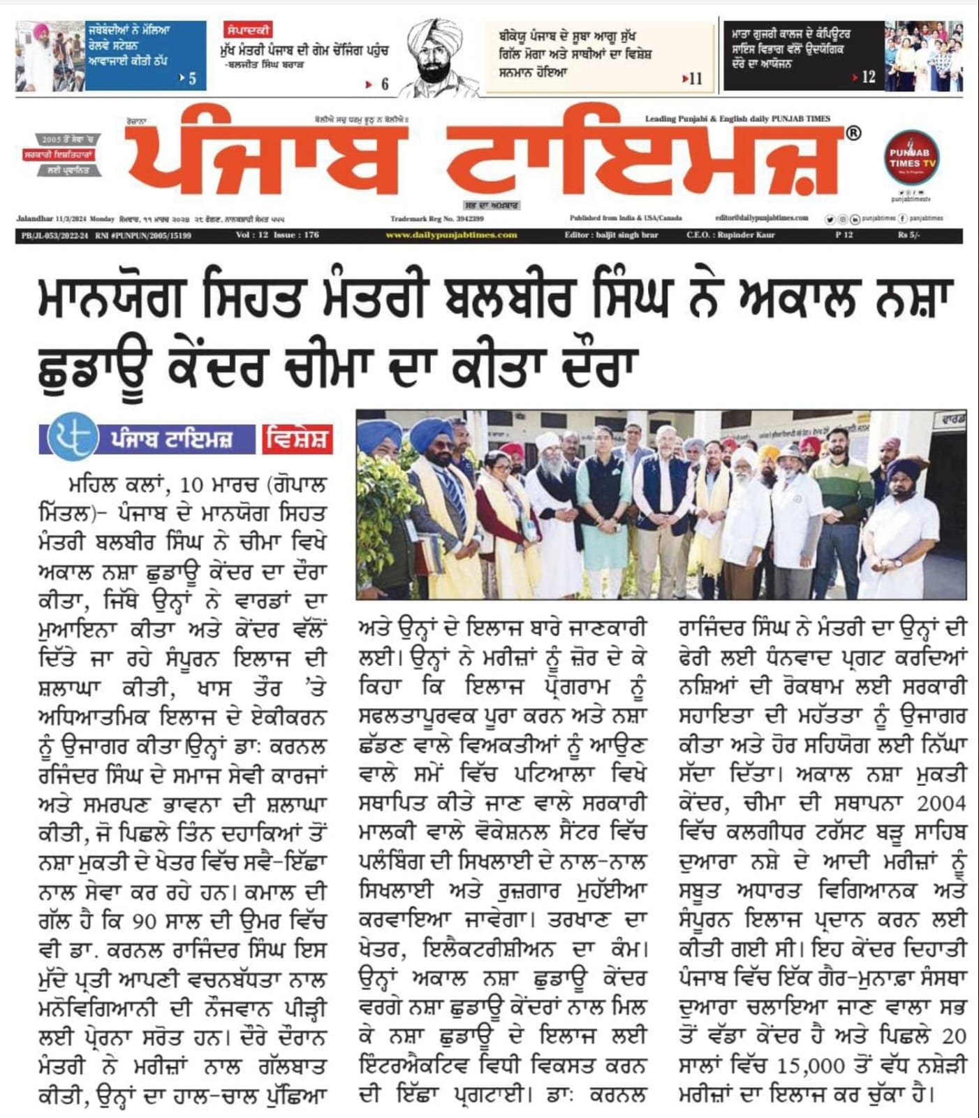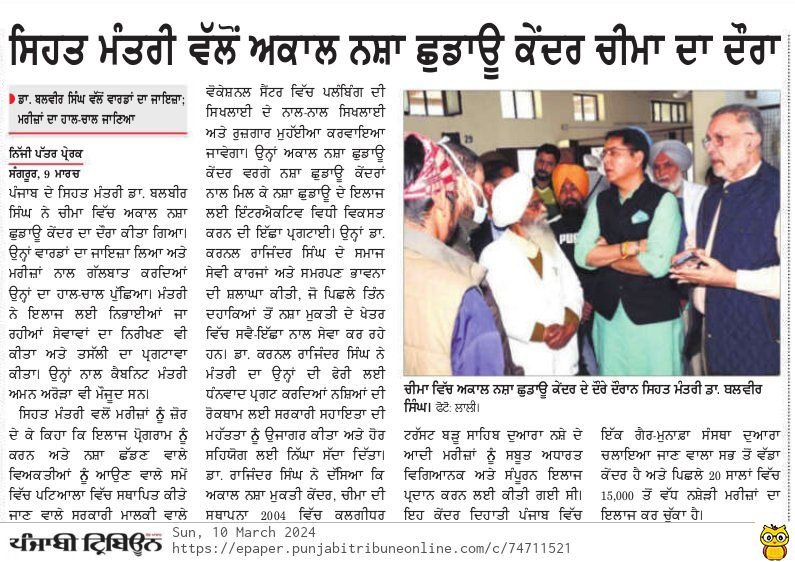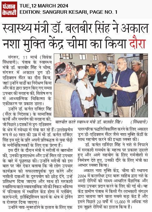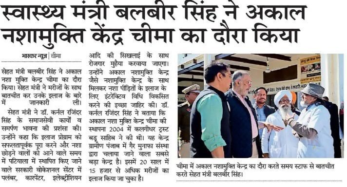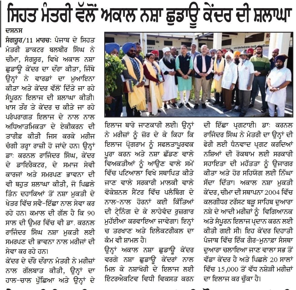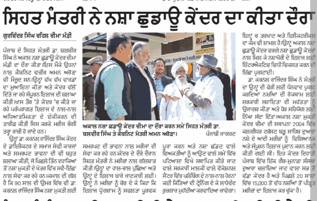 The Honourable Health Minister of Punjab, Balbir Singh, visited the Akal Drug De-Addiction Centre in Cheema, Sangrur